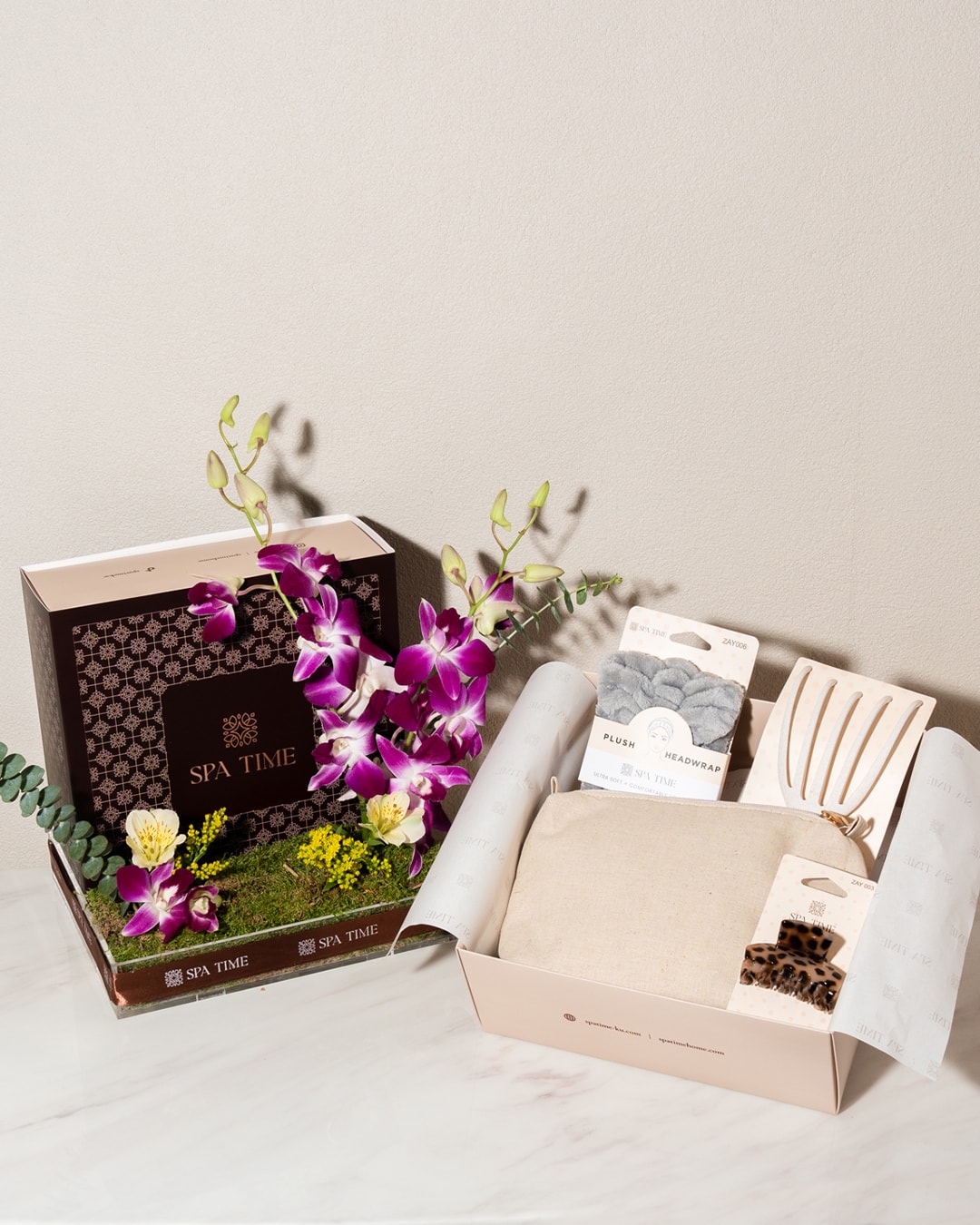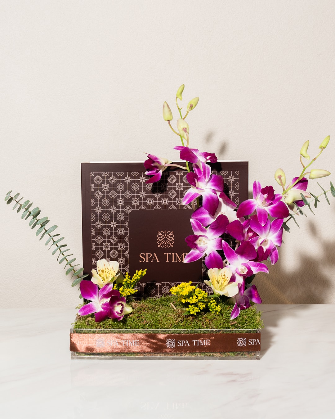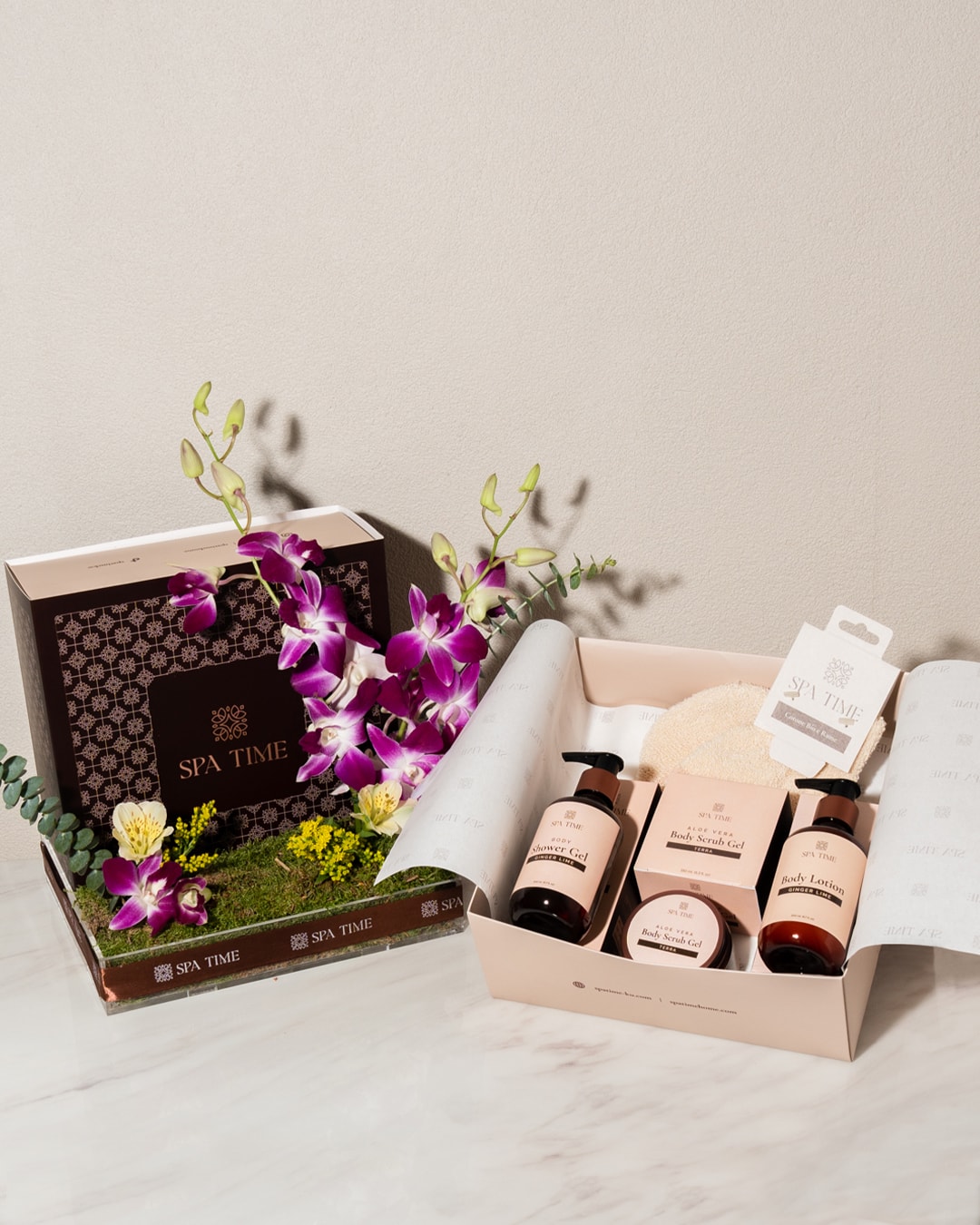 Present a ultimate spa-at-home experience with this Self-Care Gift Box surrounded by enchanting orchids.